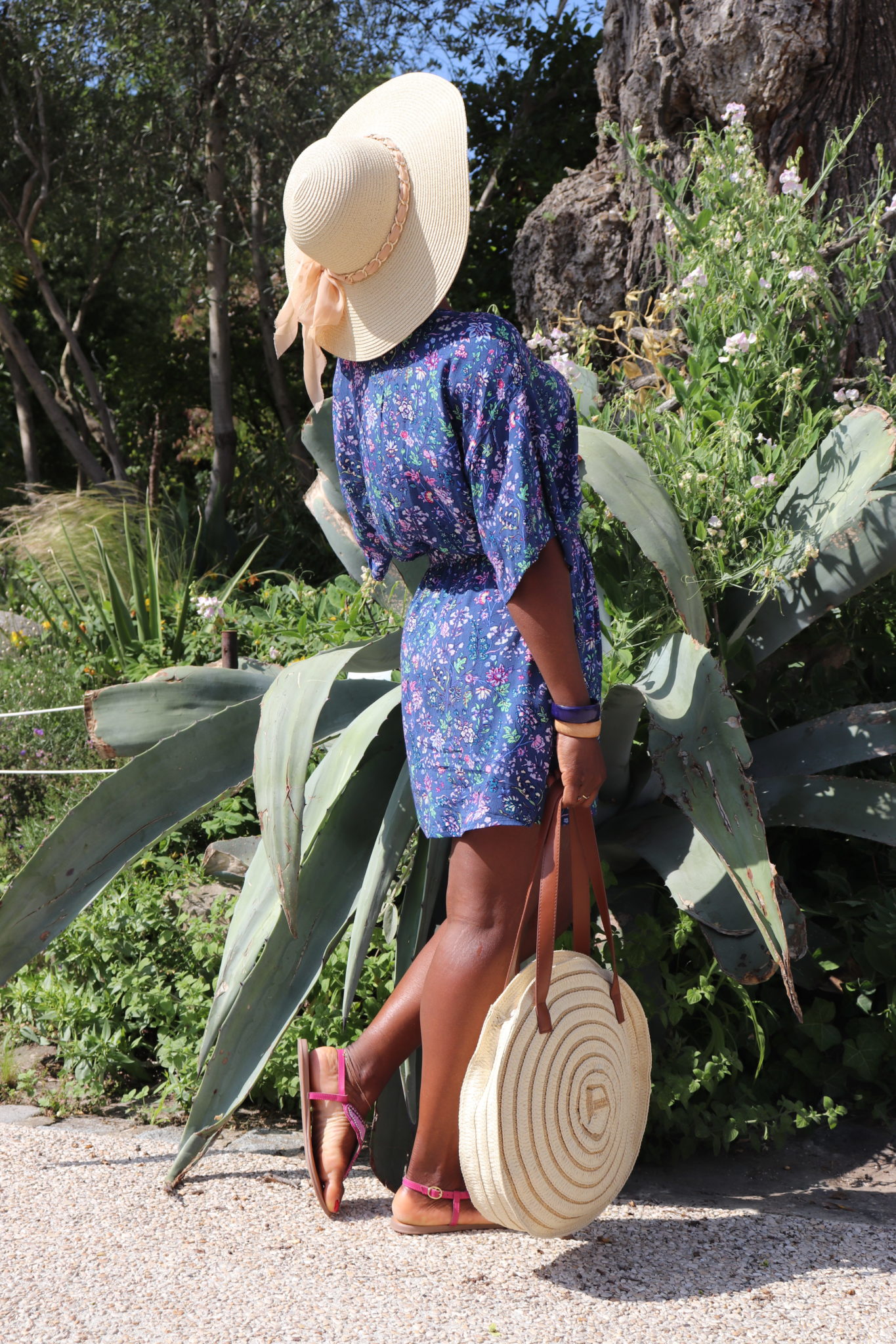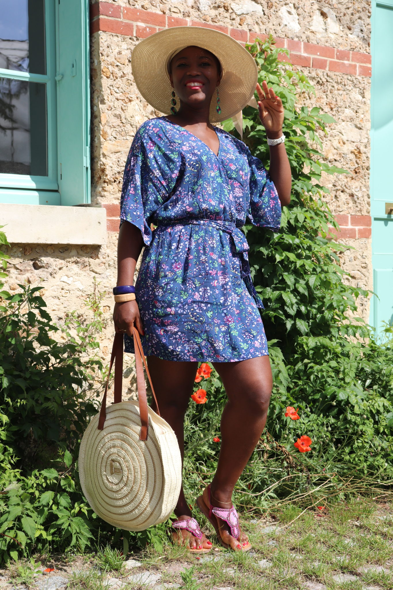 - Robe bleue fleurie Gap, sandales Manoukian, Chapeau et sac en paille dénichés dans la boutique de déstockage discount « Paris affaires » à petits prix (les 2 pièces pour moins de 30 euros), bracelets traditionnels du Burkina-Faso et BO du Kenya.