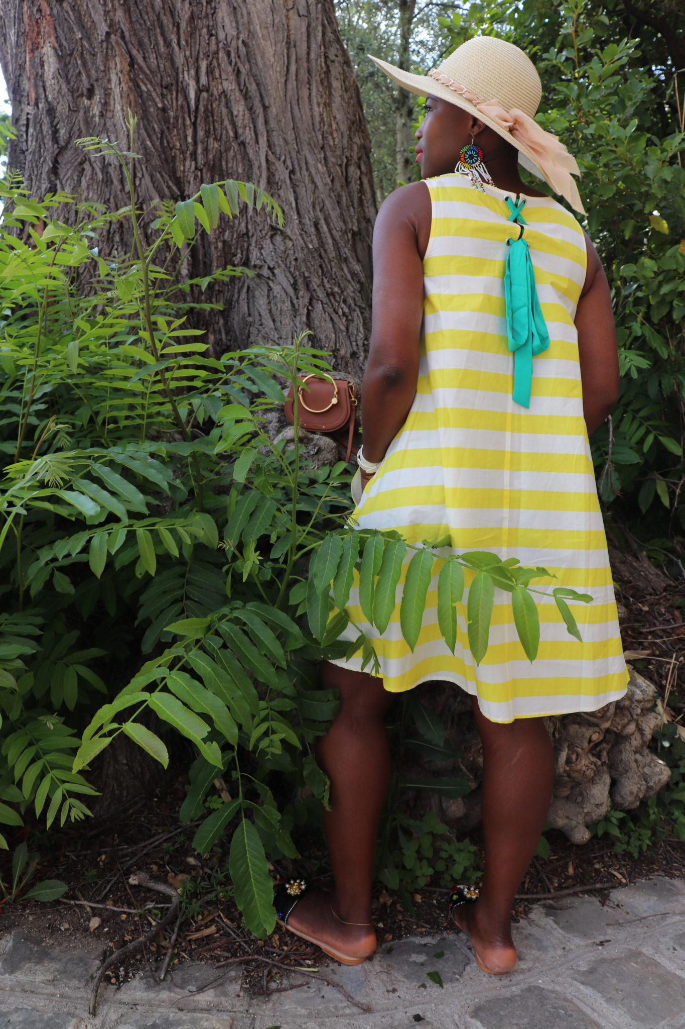 - Robe jaune et blanche de chez La Redoute, mules de chez Manoukian, sac Chloé Nile, Chapeau déniché dans la boutique de déstockage discount « Paris affaires », bijoux traditionnels du Kenya (BO et bracelets).